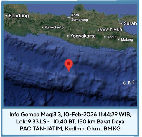 Perairan Laut Selatan Jawa dan sekitarnya tetap aktif, dengan gempa terbaru seperti magnitudo 3.3 pada 10 Februari pukul 21:29 WIB (10.5 LS–113.26 BT, kedalaman 10 km) dan magnitudo 3.6 pukul 12:04 WIB (9 LS–110.39 BT).
