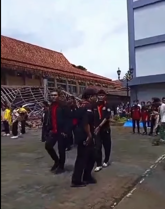Mahasiswa berhambura memberikan pertolongan kepada rekan-rekannya yang ntertimpun reruntuhan atap pendopo FKIP, Unsil, Tasimalaya, Jabar, Minggu 16 November 2025. Foto: Instagram@adi_irawan_dje
