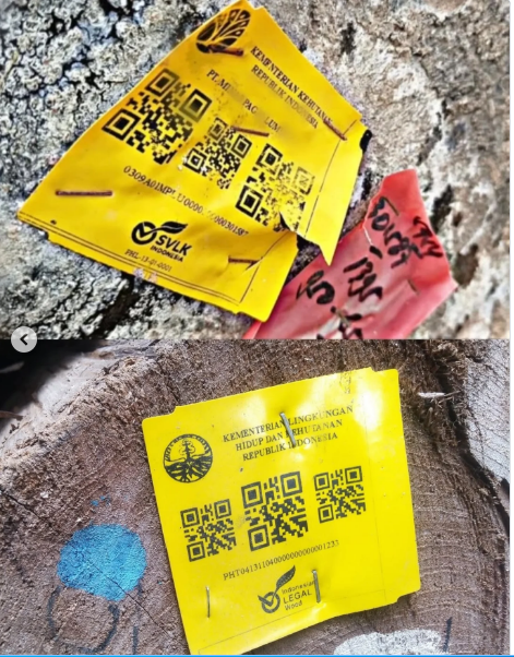 Kayu-kayu ini ditemukan memiliki nomor identifikasi, barcode, dan stiker kuning dari Kementerian Kehutanan RI serta label PT Minas Pagai Lumber, sebuah perusahaan konsesi hutan di Sumatera Barat.