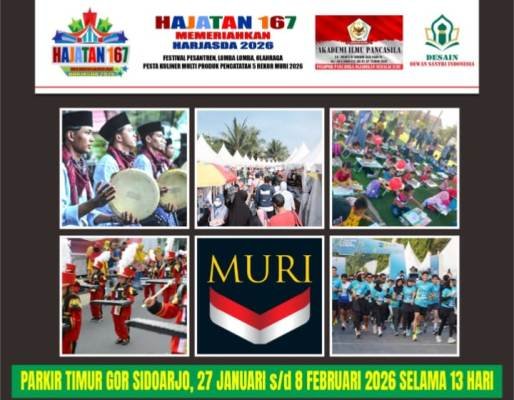 Hajatan 167 Harjasda Tahun 2026 akan digelar selama 13 hari mulai tgl.27 Januari s/d 8 Februari 2026 buka mulai jam 09.00 pagi sampai jam 22.00 Wib, mengambil tempat di Lapangan Parkir Timur GOR Delta Sidoarjo.