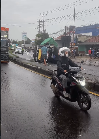 Sayangnya, manuver itu malah merusak as roda hingga patah, membuat kendaraan oleng dan terguling ke badan jalan.