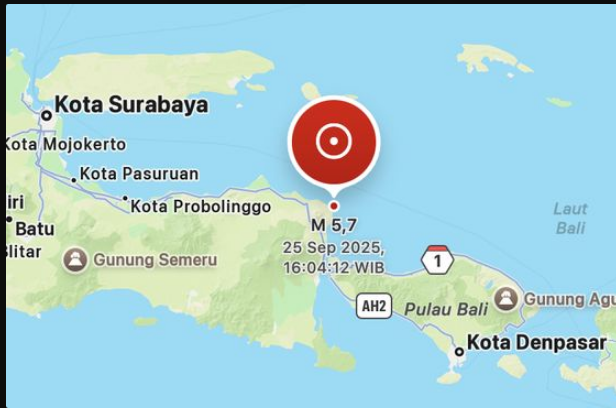 Gempa bumi bermagnitudo 5,7 mengguncang wilayah Banyuwangi, Jawa Timur, pada Kamis, 25 September 2025, pukul 16.04 WIB. Pusat gempa berada di laut, tepatnya 46 kilometer timur laut Banyuwangi dengan kedalaman 12 kilometer. Foto: CNBC
