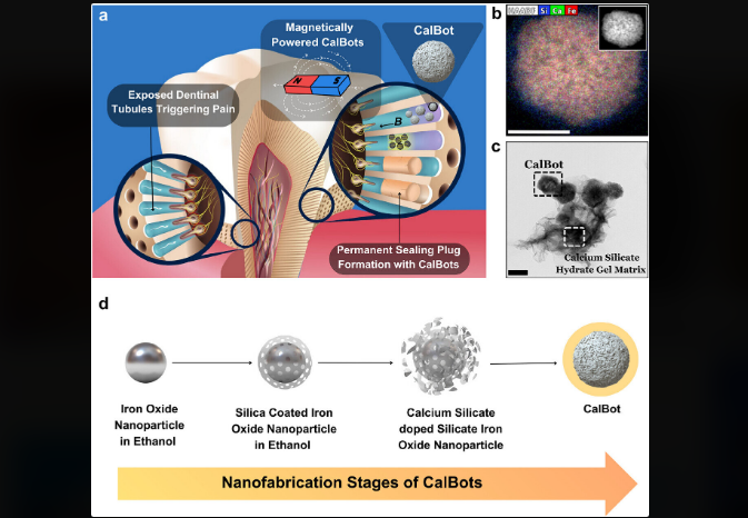 CalBots, yang ukurannya bahkan lebih kecil dari rambut manusia, menggunakan medan magnet untuk menavigasi ke saluran mikroskopis di dalam gigi (dentinal tubules).