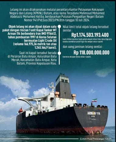 Kejaksaan Agung mengumumkan bahwa lelang kapal supertanker MT Arman 114 akan dilaksanakan pada Selasa, 2 Desember 2025, dengan batas akhir penawaran pukul 14.00 WIB. Penjelasan lelang (aanwijzing) dijadwalkan pada Senin, 24 November 2025, pukul 14.00–16.00 WIB di Kejaksaan Negeri Batam. Proses lelang ini dilakukan melalui laman resmi lelang.go.id, dan para peserta diwajibkan mengunggah dokumen persyaratan serta menyerahkan dokumen fisik ke Kejaksaan Negeri Batam paling lambat tanggal 26 November 2025.