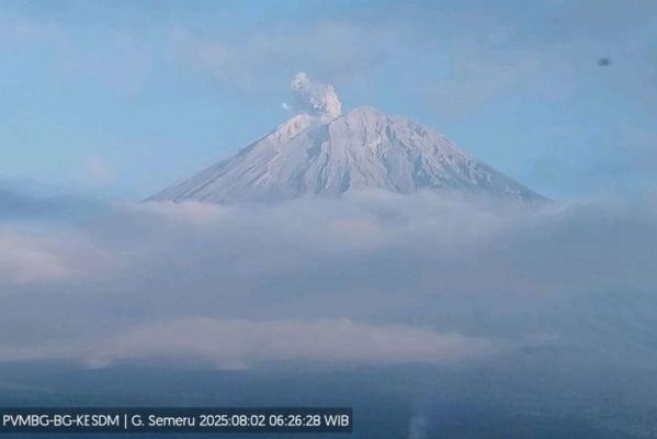 LUMAJANG, SWARAJOMBANG.COM – Gunung Semeru, Jawa Timur, erupsi lagi pada Jumat (13/2/2026) pukul 07.42 WIB. Kolom abu setinggi 1.000 meter di atas puncak (total ketinggian 4.676 mdpl) berwarna kelabu tebal, mengarah utara-timur laut.