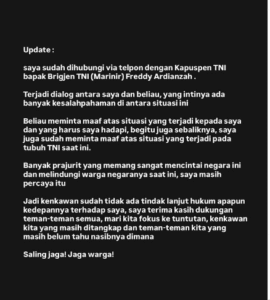 Sementara itu, Ferry Irwandi melalui akun Instagram @irwandiferry pada Sabtu, 13 September 2025, mengunggah pernyataan damai dengan TNI sebagai berikut: