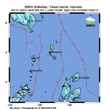 BMKG menyatakan gempa tektonik berkekuatan awal 7,1 magnitudo di Kepulauan Talaud pada 10 Januari 2026 tidak berpotensi tsunami. Analisis mereka merevisi magnitudo menjadi 6,4 dengan pusat gempa 40 km tenggara Melonguane pada kedalaman 31 km.