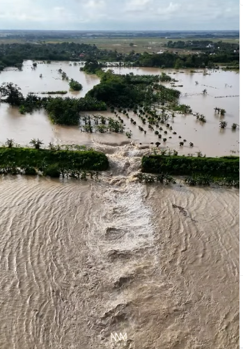 Ada dua tanggul Sungai Tuntang jebol, Senin 16 Februari 2026., di kabupayen Demak. Air meluber ke kampuang-kampugn, menyebabkan jalur Demak-Semarang tidak dapat dilalui kendaraan. Foto: Instagram@a6_gabuts