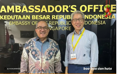 Foto bersama mantan Dubes RI di Singapura, Suryopratomo bersama Joseph Oetomo, sebagai bos utama PT Toba Lestari Pulp Tbk. Foto: Instagram@baligetalk