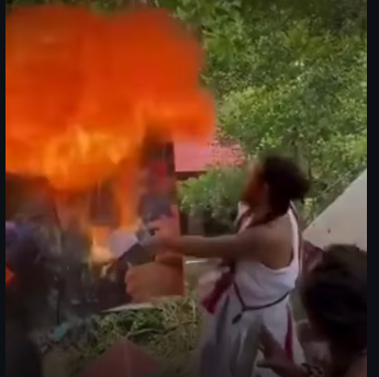 Konten ini, diunggah akun seperti @kotekscoid pada 15 Desember 2025, menampilkan orang-orang berpakaian ritualistik yang “menusuk” spanduk dan menyemburkan api—jelas sebagai propaganda psikologis atau satire.
