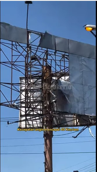 Sebuah papan reklame di Mojokerto jebol diterjang angin kencang, sebagian seng lepas, terjadi Selasa, 2 September 2025. Foto: tangkap layar video Instagram@kabarmojokerto.id