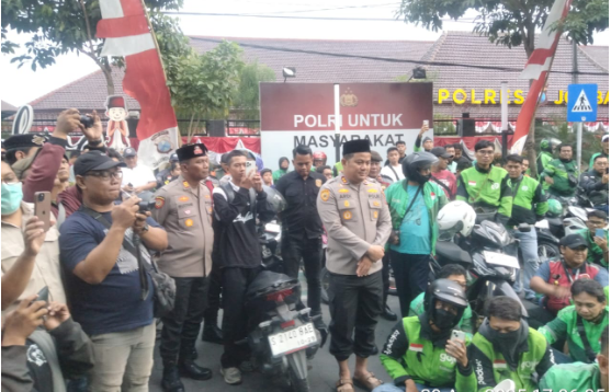 Kapolres menegaskan akan melaporkan tuntutan massa ojol Jombang, “Percayakan kepada institusi kepolisian untuk menangani kasus ini secara tuntas!” kata Ardi disambut apllause msaa Ojol.