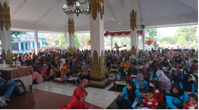 Ini dia ibu sayang anak bersatu padu mengikuti lomba mewarnai: Mamamia, yang diselenggarakan oleh IGTKI, di pendopo kecamatan Gudo, Jombang, Sabtu, 9 Agustus 2025. Foto: Swarajombang.com/ Ipong D. Cahyono