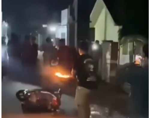 Karena diduga hendak mencuri sepeda motor, warga langsung mengamankan keduanya. Emosi massa yang memuncak membuat sepeda motor yang diduga milik pelaku dibakar di tempat.