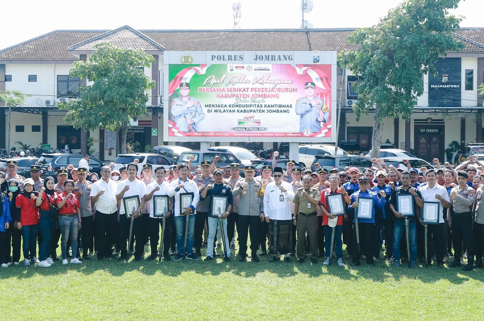 JOMBANG, SWARAJOMBANG.COM – Polres Jombang bersama sejumlah serikat pekerja/buruh Kabupaten Jombang menggelar Apel Akbar Kebangsaan di lapangan Kapolres, Kamis (23/10/2025).