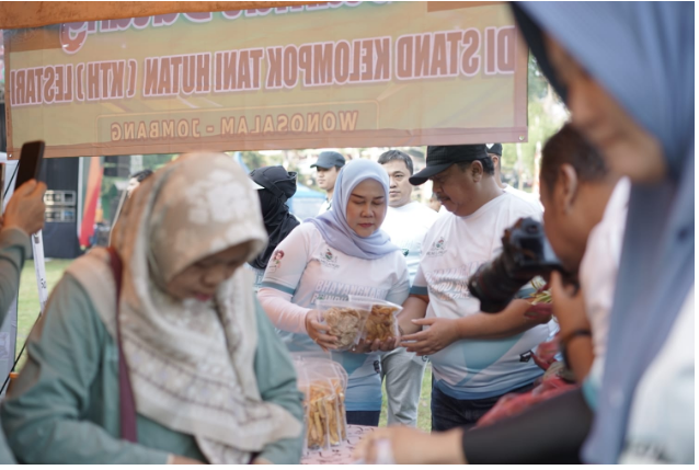 Bupati Jombang, H. Warsubi, hadir langsung menyapa warga dan pelaku UMKM. Dengan antusias, ia mencicipi sejumlah produk lokal seperti ketan durian, kopi salak, dan jenang salak hasil olahan ibu-ibu Bhayangkari dalam program pemberdayaan berbasis hutan rakyat.