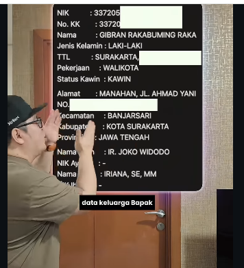 Dalam tayanan video di akun instagram@realmrbert, 3 Januari 2026, menunjukkan copy-an data pribadi wakil presiden Gibran Rakabuming Raka, lengkap dengan KTP, BPJS, KK, alamat rumah, telepon, alamat email, serta data istri, anak dan, orang tuanya lengkap. Foto: Instagram@realmrbert Perbesar