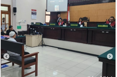 Majelis Hakim PN Mojokerto menyidangkan kasus keamtian Mukhamat Alfa, 18, atlet silat pelajar SMK raden Rahmada, Mojosari, Senin 3 November 2025. Alfan ditemukan tewas mengapung di sungai Brantas, 3 Mei 2025 silam. Foto: Instgram@kabarmojokerto