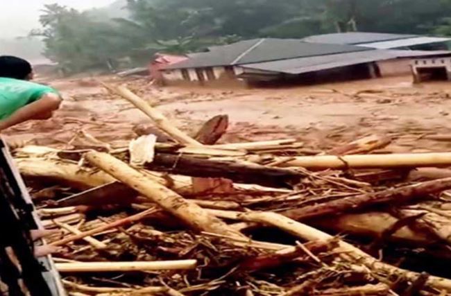 Kayu gelondong terbawa banjir