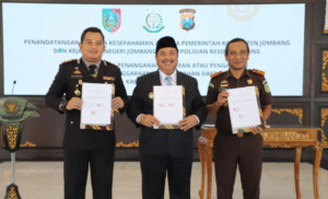 JOMBANG, SWARAJOMBANG.COM – Pemerintah Kabupaten Jombang, Kejaksaan Negeri Jombang, dan Polres Jombang telah secara resmi menandatangani perjanjian kerja sama. Tujuannya untuk menyatukan usaha antara aparat yang mengawasi pemerintah dan aparat hukum dalam menangani pengaduan yang muncul di pemerintahan daerah Jombang.