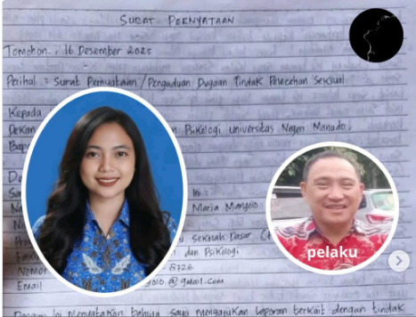 Di lokasi, polisi menemukan secarik surat pernyataan bertanggal 16 Desember 2025 yang ditujukan kepada Dekan Fakultas Ilmu Pendidikan dan Psikologi Unima, Dr. Aldjon N. Dapa, M.Pd. Surat tersebut berisi pengaduan dugaan pelecehan seksual oleh dosen bernama Danny A. Masinambow, SP., M.Pd.