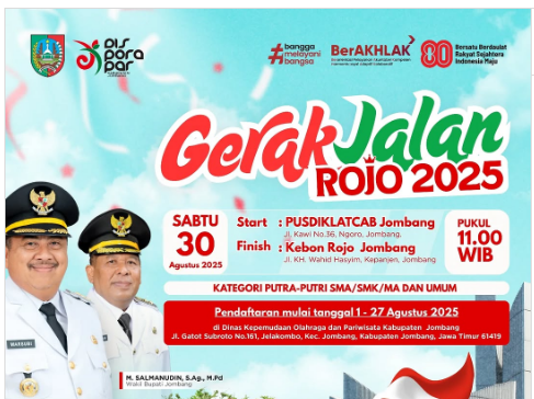 KREDONEWS.COM, JOMBANG– Panitia Gerak Jalan Ngoro-Jombang (ROJO), Dinas Olahraga, Pemuda dan Pariwisata (Disporapar) Pemkab Jombang berencan akan dilaksanakn Sabtu, 30 Agustus 2025.