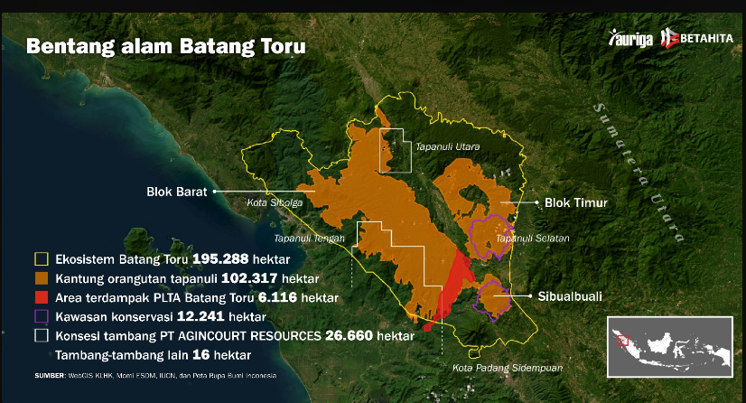 Ekosistem Batang Toru merupakan habitat asli Orangutan Tapanuli, salah satu spesies langka. Wilayah ini juga menjadi lokasi berbagai aktivitas perusahaan mulai dari tambang emas, PLTA, hingga perkebunan karet dan sawit.
